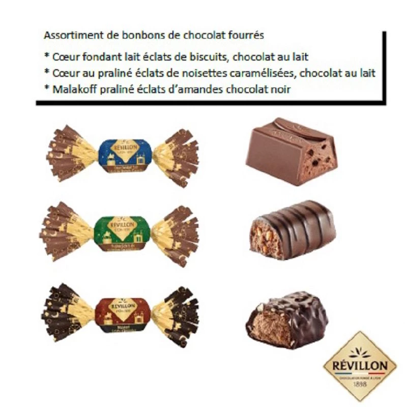 Bonbons de chocolat au lait fourrés à la pâte à tartiner (noisettes) et céréales.